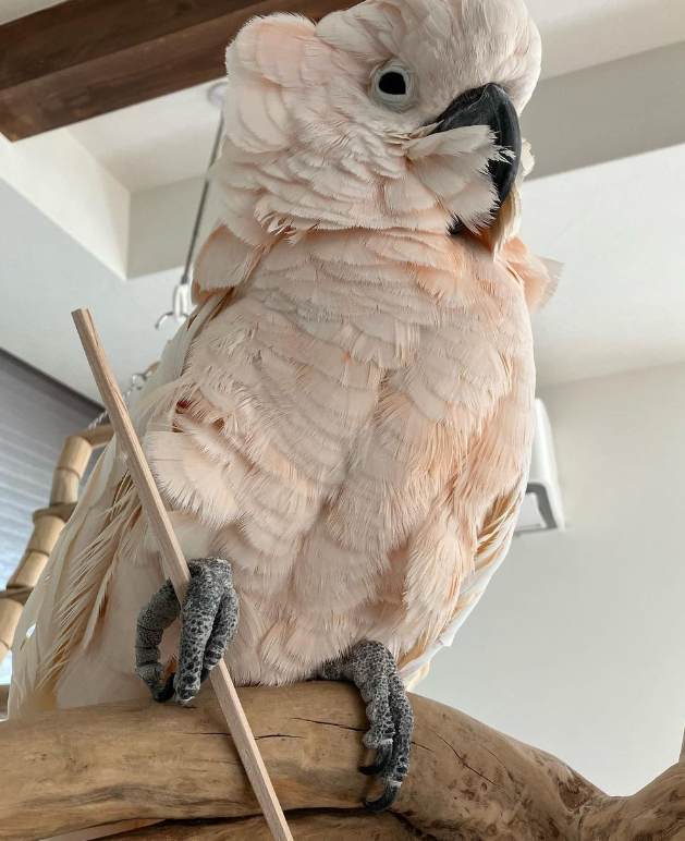 Ein 12 Monate alter Molukken-Kakadu zeigt nun seine charakteristische Persönlichkeit: