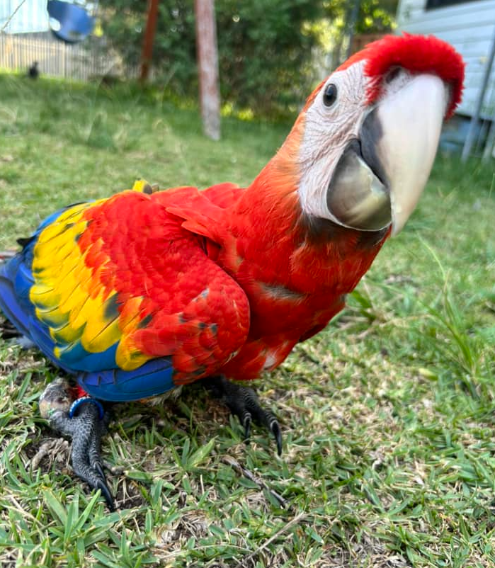 Scarlet Macaws sind intelligent, verspielt und sehr soziale Vögel, die sich schnell an ihre Bezugspersonen binden. Dieses junge Männchen ist bereits zahm, liebt Interaktion und zeigt ein harmonisches, ausgeglichenes Verhalten.